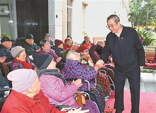 圖為12月12日,全國政協(xié)副主席、中央代表團副團長馬飚在仙源公司夕陽紅養(yǎng)老中心看望老人。